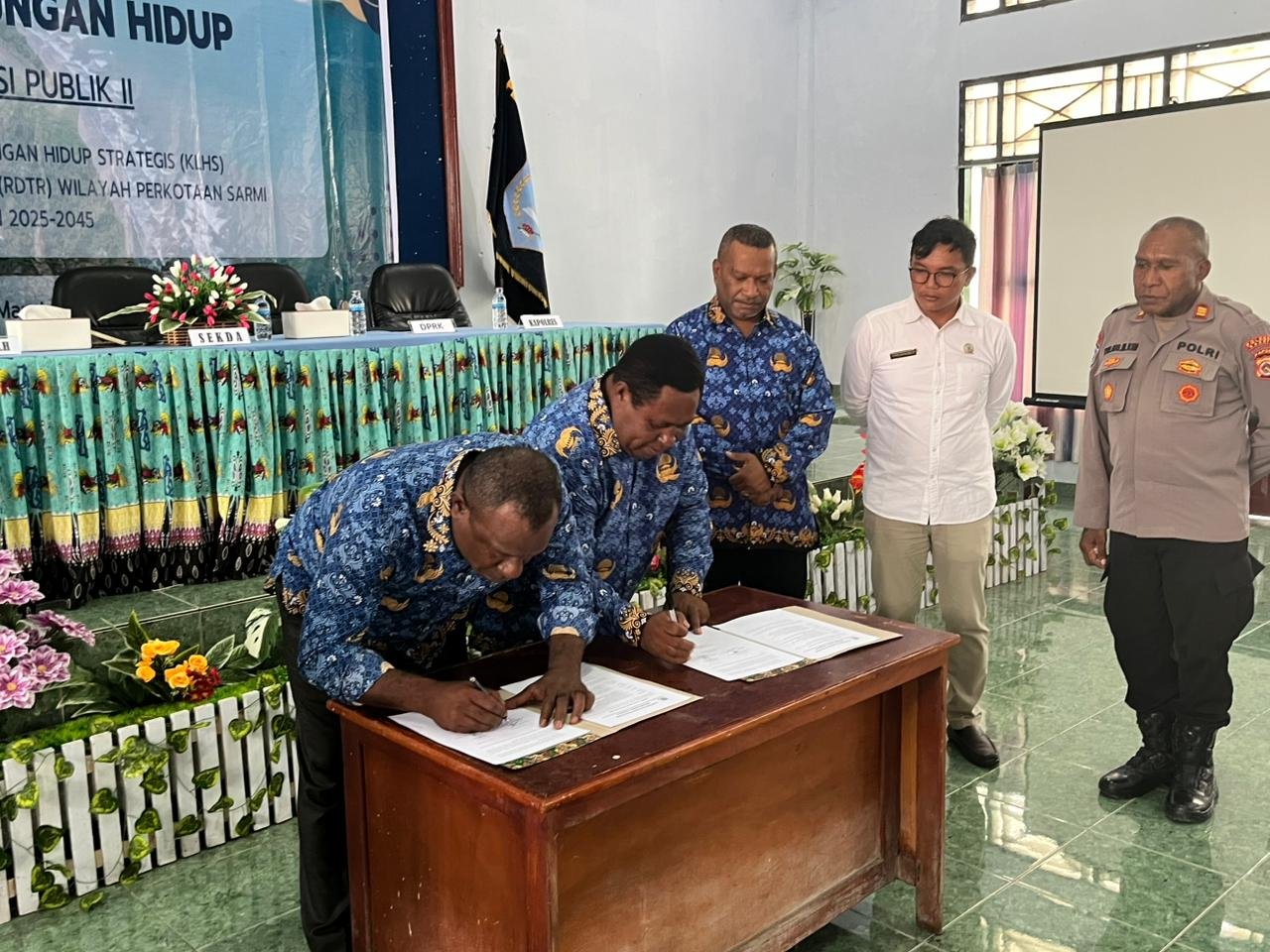 Sarmi – Kasat Binmas Polres Sarmi AKP Yulianus Mapeni menghadiri kegiatan Konsultasi Publik II dalam rangka penyusunan dokumen Kajian Lingkungan Hidup Strategis (KLHS) dan Rencana Detail Tata Ruang (RDTR) wilayah perkotaan Sarmi yang dilaksanakan pada Kamis (5/3/26) bertempat di Aula Kantor Bupati Sarmi, Distrik Sarmi Selatan, Kabupaten Sarmi.