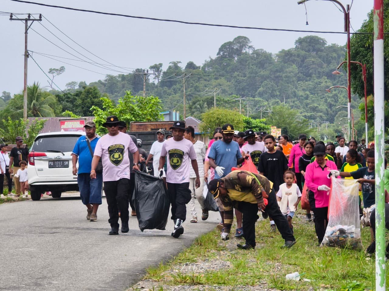 Sarmi – Kapolsek Bonggo IPTU Yustus Maudul, SE., M.Si. bersama anggota Polsek Bonggo mengikuti kegiatan jalan santai, pembersihan atau pemungutan sampah plastik serta penanaman pohon yang dilaksanakan di Kampung Kiren dan Kampung Narum, Distrik Bonggo Timur, Jumat (13/3/2026).